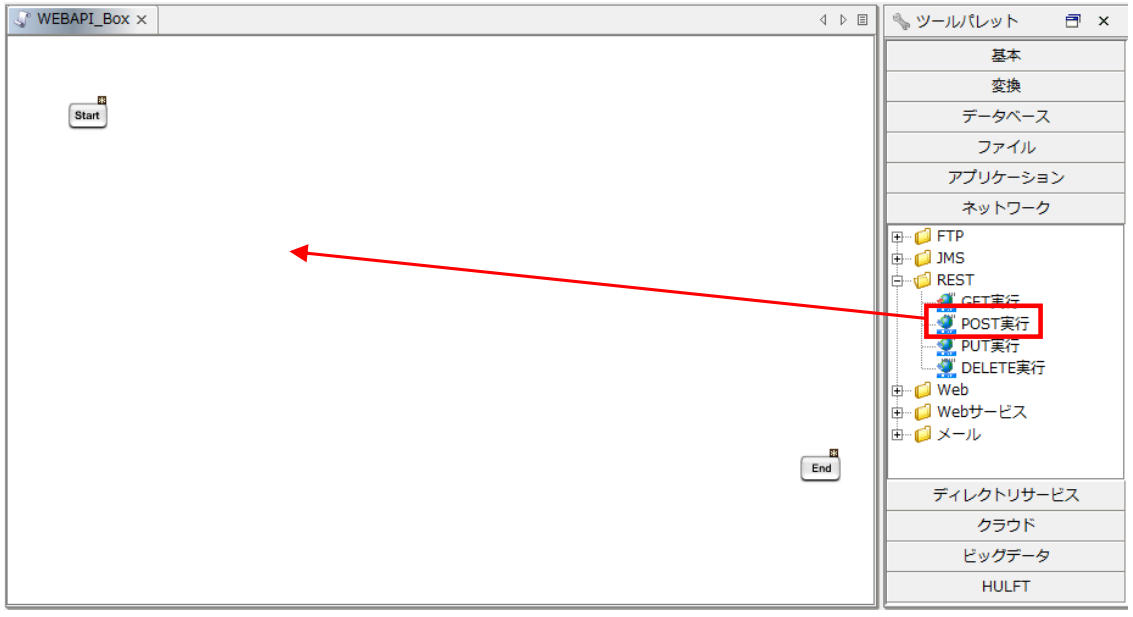 ツールパレットから[ネットワーク] - [REST] - [POST実行]をスクリプトキャンバスにドラッグ&ドロップします。