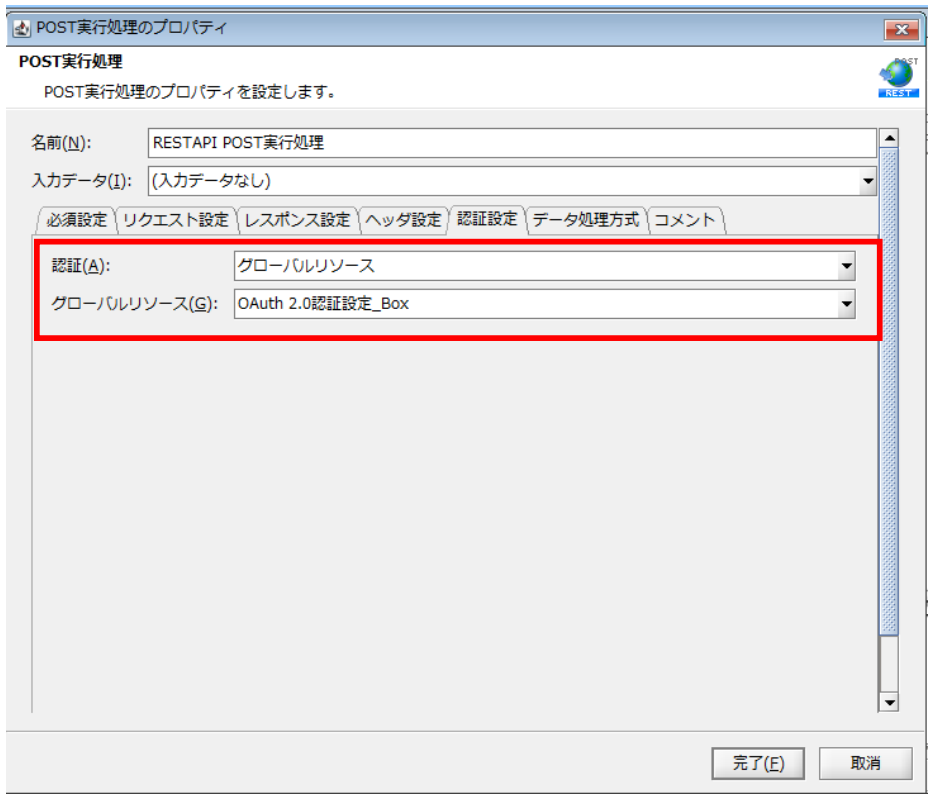 「POST実行処理」プロパティ設定ダイアログで、以下の通り設定を行います。