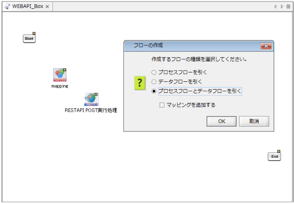 「mapping」アイコンと「RESTAPI POST実行処理」アイコンの間に、プロセスフローとデータフローを引きます。