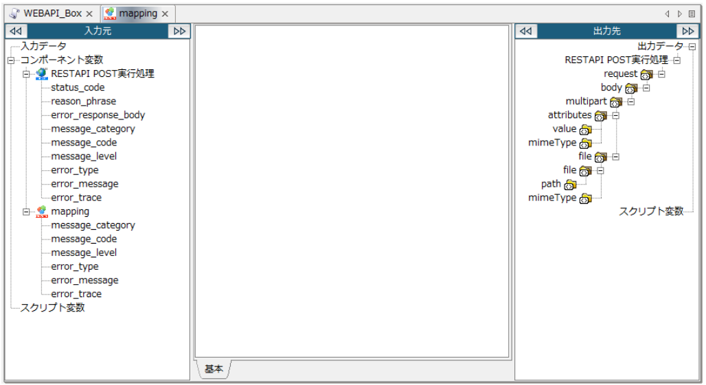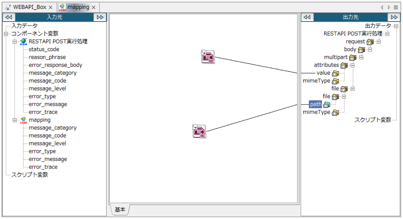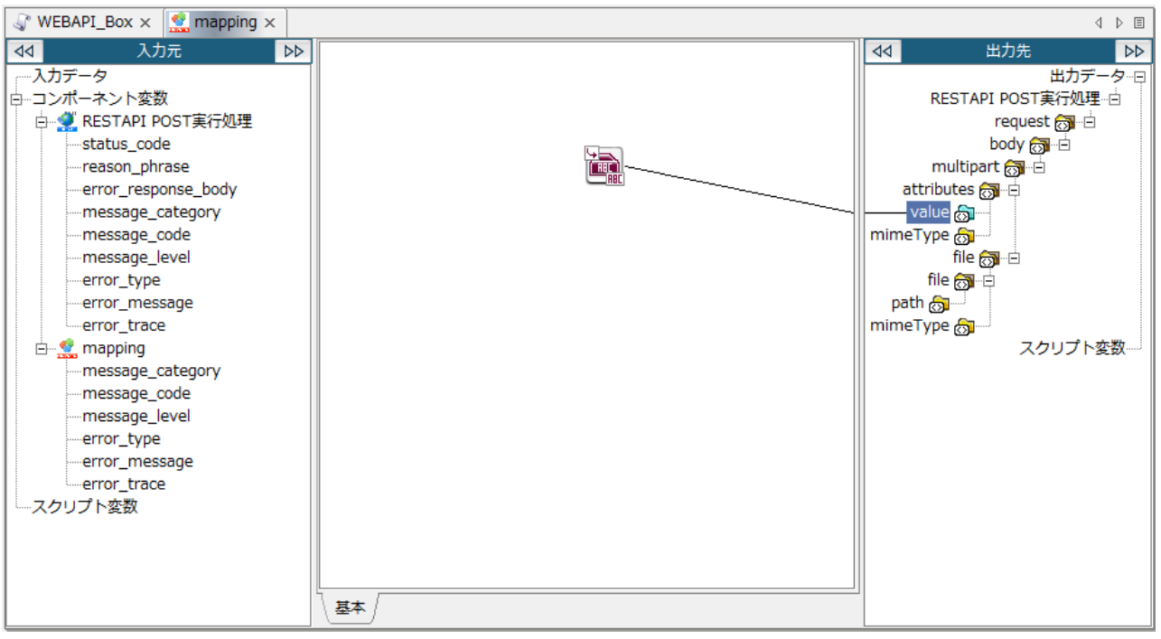 出力先には、「RESTAPI POST実行処理」アイコンの設定から、スキーマが読み込まれています。