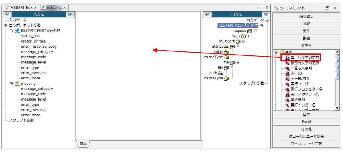 Mapperエディタのツールパレットから[文字列]-[基本]-[単一行文字列定数]をマッピングキャンバスにドラッグ&ドロップします。