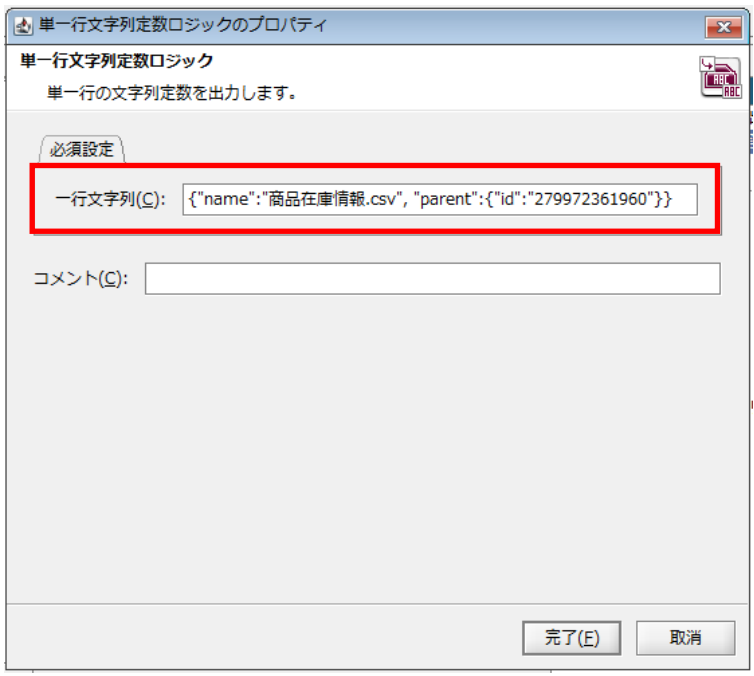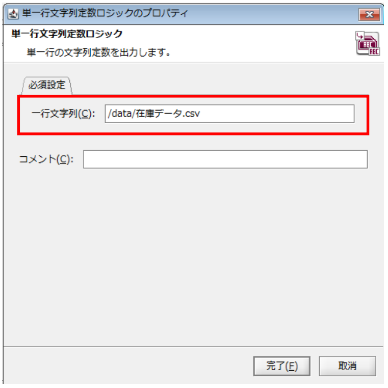 配置された「単一行文字列定数」ロジックアイコンをダブルクリックし、「単一行文字列定数ロジック」プロパティ設定ダイアログで、以下の通り設定を行います。