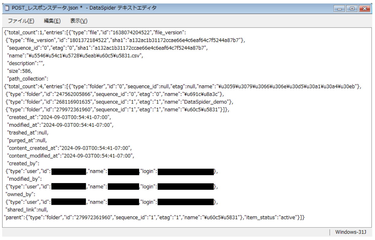 まず、「RESTAPI POST実行」アイコンのレスポンス設定にて指定したファイルに、レスポンスデータが格納されていることを確認します。