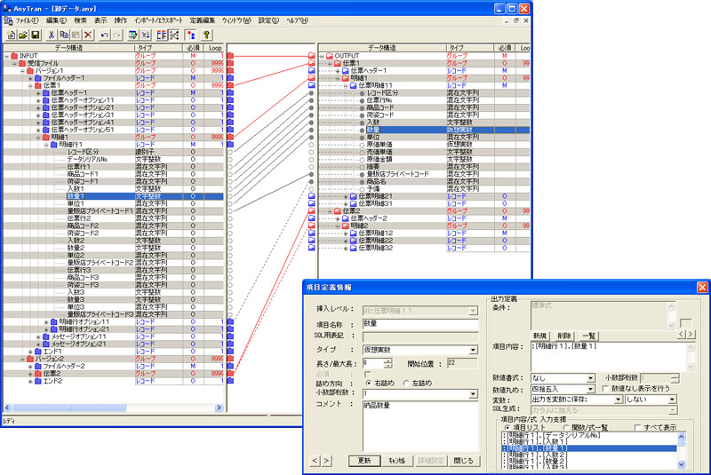 データ項目の四則演算、結合・分解、DBルックアップ、DB入出力、条件判断などさまざまな編集機能があり、これらの編集をマッピング・ツール「AnyMapper」で定義することで簡単かつノンプログラミングで実現することができます。AnyMapperはWindows GUIベースで非常に使いやすく、変換処理検証や仕様変更でのデータ項目の追加変更も簡単に行え、更には定義内容からエクセル・ベースの仕様書の出力も可能ですので、開発やメンテナンスの負荷とコストの削減が可能です。