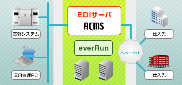 コストパフォーマンスに優れたIAサーバ+Marathon社everRunのテクノロジを使用した、間断ないEDIサービスをFT機や安心安価で運用しやすいHAクラスタにEDIシステムを搭載しています。