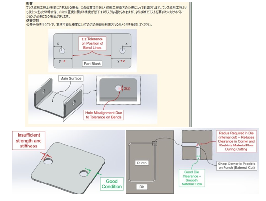 穴非垂直方向の穴/ 打ち抜き加工-鋭角コーナー/ 穴エッジに近接-詳細 など