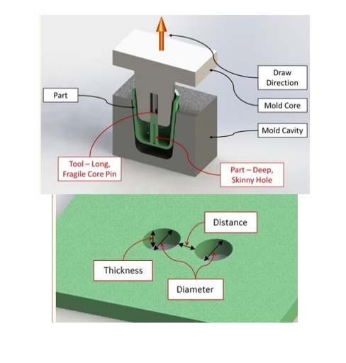 穴非垂直方向の穴/ ドラフト角度/ パーティングライン上のエッジの最小半径/ ブラインド穴/ 穴の近接性/ 穴の径に対する穴の深さの比/ 最小/最大外部エッジ半径/ 最小/最大肉厚 など