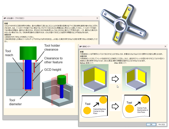 最小内径フィレット径/ ツールホルダのアクセス制限/ ツールリーチ過大/ 代替可能定尺長方形棒材/ 規格外ドリル点角度/ 規格外皿穴/ LD比最大(フライス加工)/ 鋭角コーナー など
