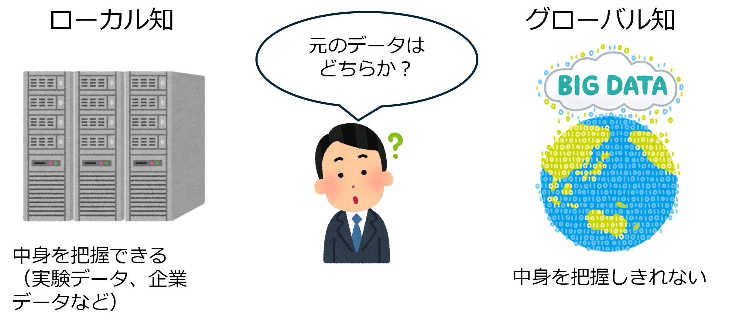 繰り返しになりますが、重要なのは道具ではなく、そのアウトプット(示唆・提示・判断・意思決定など)の元になったデータが何か、ローカル知であるか、グローバル知であるかです。たとえば、AIアシスタントを使う場合でも、自前データを与えて解析させることは前者の意味になります。