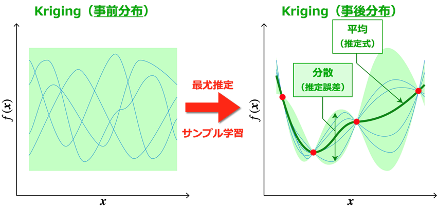 ステップ1で生成されたサンプルデータを学習することで、目的関数 f (x) を代数式近似したサロゲートモデルを構築します。ベイズ最適化では、サンプルデータに適合する確率過程をモデル化する「Kriging」[2] (「ガウス過程」[3]もほぼ同義)が使用されます。サンプルデータを学習する前の時点(事前分布)では、確率過程は明確な傾向を示さずにランダムに振る舞う無数のモデルの集合体に過ぎず、サロゲートモデルとしての体を成していません。そこで、「最尤推定」により、サンプルデータを最も正確に再現できる確率過程の状態(事後分布)を求めます。最尤推定は、サンプルデータの再現確率を最大化するように、モデルの形状を制御するパラメータを求める最適化問題を解くことで行われます。こうして求められた確率過程の平均は目的関数の推定式として、確率過程の分散は推定に含まれうる「不確かさ」(すなわち、推定誤差・エラーバー)を表す式としてそれぞれ導出されます。