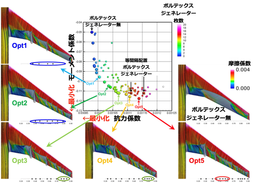 , …の空間内に探索方向ベクトルを複数かつ均等に配置し、各ベクトルに近隣するサンプルデータのうちPareto最適解となるものを基準として、改善期待量を各探索方向に沿う距離として算出したものです。目的関数空間を偏りなく覆う探索方向ベクトルの各々に沿ってPareto最適解の探索が促進されるため、実際の工学設計において有益な情報となる、目的関数のトレードオフの俯瞰的な理解が期待されます。