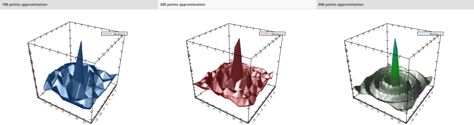 視覚的に理解するため、よく知られている波紋の関数Z = sin(R)/R(ただしR = (x2+y2)0.5)について考えていきます。DSEブロックのラテン超格子法を使用して100、200、800点のデータサンプルを生成し、このそれぞれについてモデルビルダーで近似モデルを作成しました。