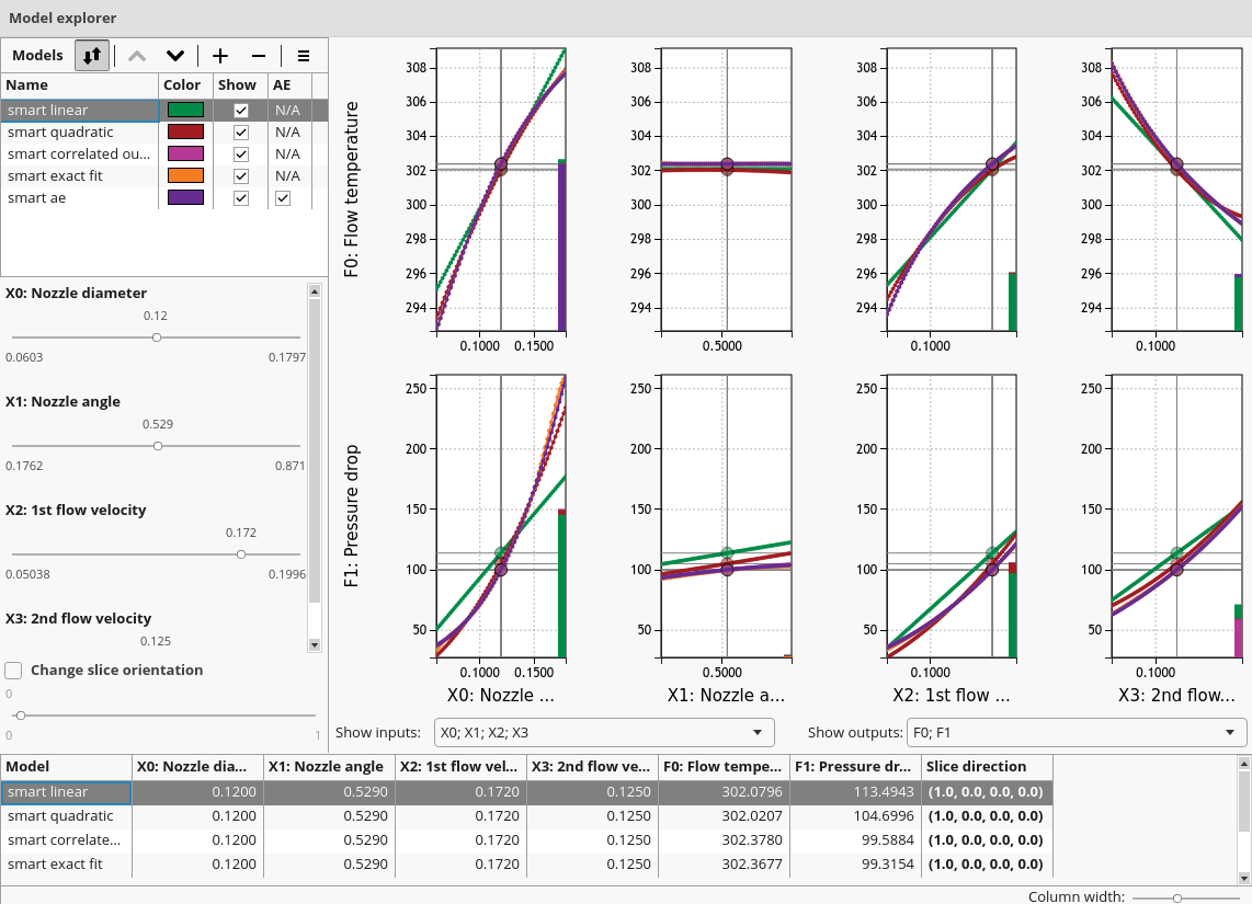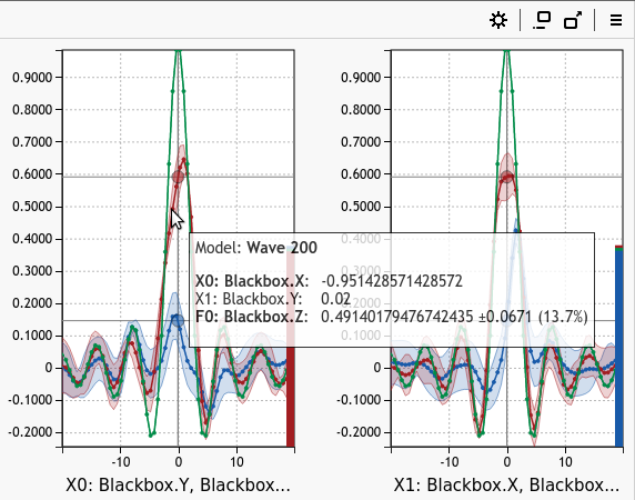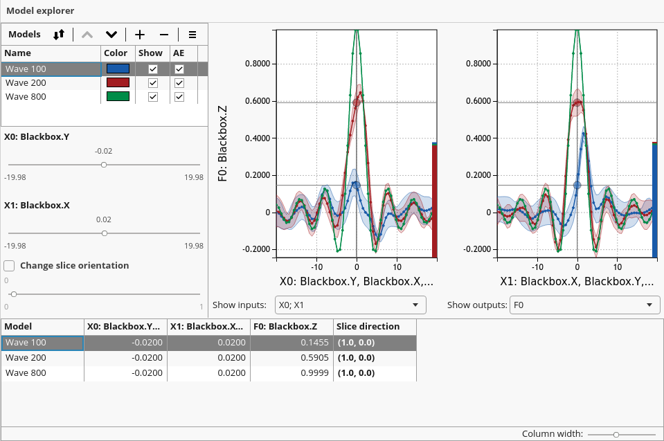 モデルエクスプローラーでは各i, jにおける断面Fi(Xj)を、2次元の直交座表で表示します。断面は方向と原点(選択した断面でのX次元の点)で定義され、デフォルトでは方向は軸と同じになります。原点はモデルリストのすぐ下のスライダーから変更可能で、モデルごとに異なる原点を設定することもできます。