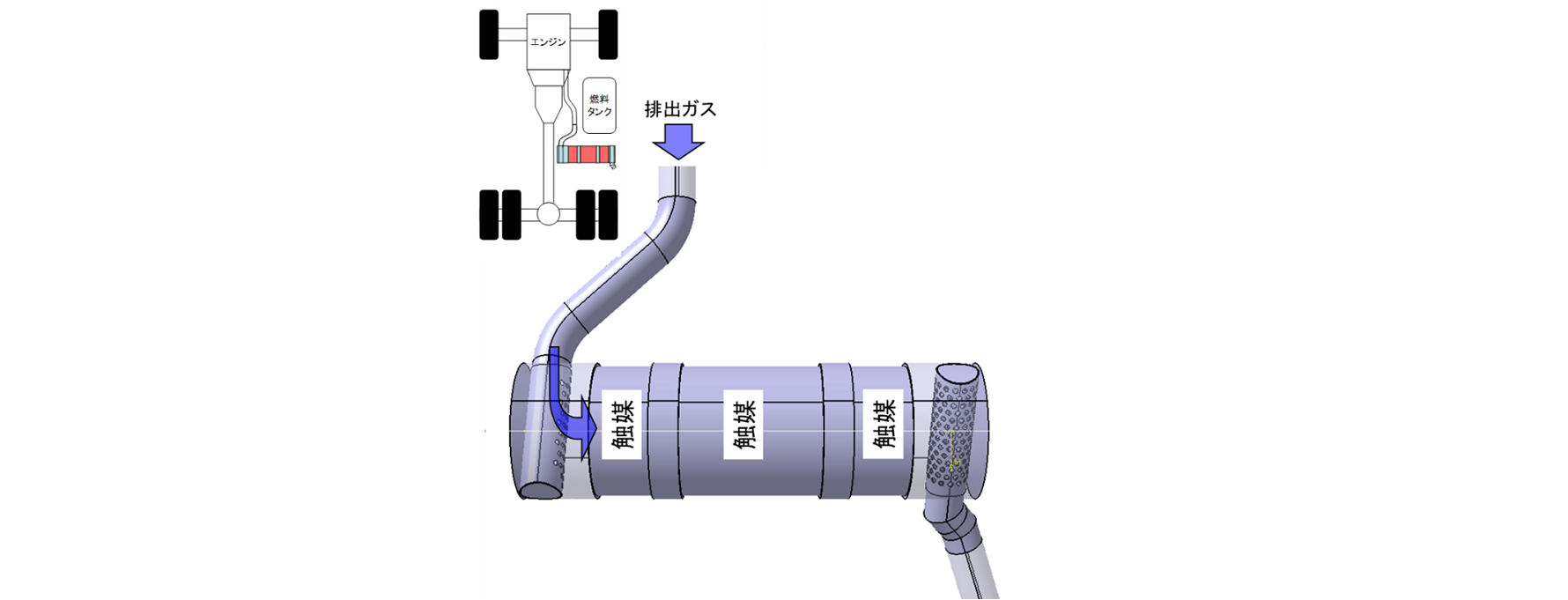 排気ガスの横入れ横出しの新型マフラーを対象にしていますが、環境対策上、触媒機構を有するマフラーです。構造は3D-CAD(CATIA)で構成し、排気ガス相当の流体の流れの制御(SCRYU/Tetraによる)を目的にした設計です。