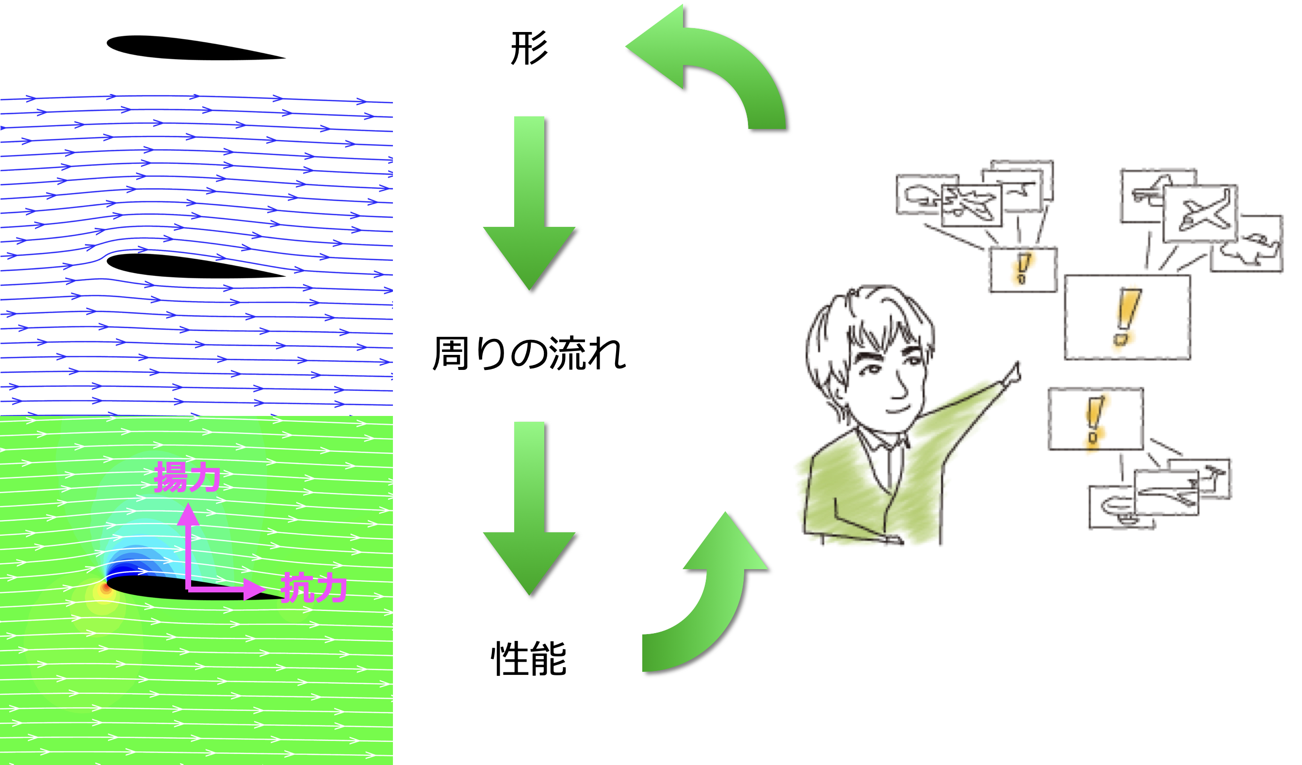 家電などの小型のものから、自動車・航空機などの大型のものまで、昨今の多種多様な工学機械の「ものづくり」を後押ししているのが、流体力学や構造力学などの数値シミュレーションを代表とする、コンピュータを利用した工学支援システム(Computer Aided Engineering: CAE)です。例えば、航空機の設計者が機体の形を決めると、機体の周りに現れる空気の流れの様子を数値シミュレーションで再現することで、機体が所定の飛行条件でどのような性能を持つかを評価でき、設計者にフィードバックすることができます。このようにコンピュータ上で仮想的に試作を行い、設計の検討を行うことができるため、コスト低減と設計サイクルの短縮化が可能となります。これに対し、一連の設計作業をCAEではなく風洞試験だけで行うとなれば、チームで数ヶ月単位の期間にわたって、模型の設計製作から風洞試験・データ整理に取り組むことになります。