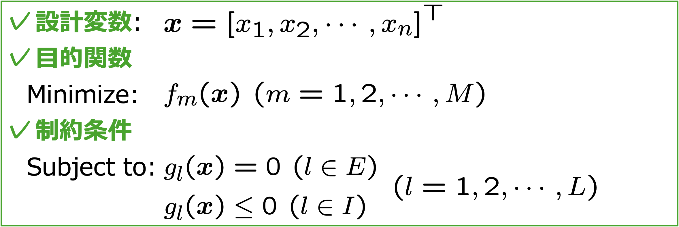 ここで、xは設計変数(計n個)からなるベクトル、fm(x)は目的関数(計M個)、gl(x)は制約条件(計L個)と呼びます。一般的に、目的関数および制約条件の関数形は未知(ブラックボックス)であるため、この問題の解xを陽に求めることは不可能です。すなわち最適化とは、すべての制約条件を満たす範囲内で、すべての目的関数を最小化(もしくは、符号を反転させて最大化)する設計変数の組み合わせ(最適解)を探索する数学問題と解釈できます。