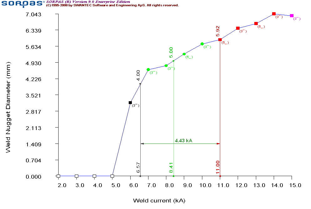 さらに、溶接プロセスの最適化を検討するために、ウェルドカーブの出力やウェルドローブの自動作成を行います。Fig.1はウェルドカーブと呼ばれ、縦軸にナゲット径-横軸に電流値を取り、予め指定した理想のナゲット径の範囲に対応する電流値を探索する機能です。この例ではナゲット径の範囲を4mm~5.8mmで指定した際の電流の良好条件を表示しています。緑で表示されている、7,8,9,10kAが良好な電流値として確認できます。Fig.2は、ウェルドローブを示しており、電流に加えて溶接時間または加圧力のパラメーターを振り、良好な溶接条件の探索を行っています。また、電流値だけでなく、加圧力または溶接時間の最適化を行うことなども有効です。