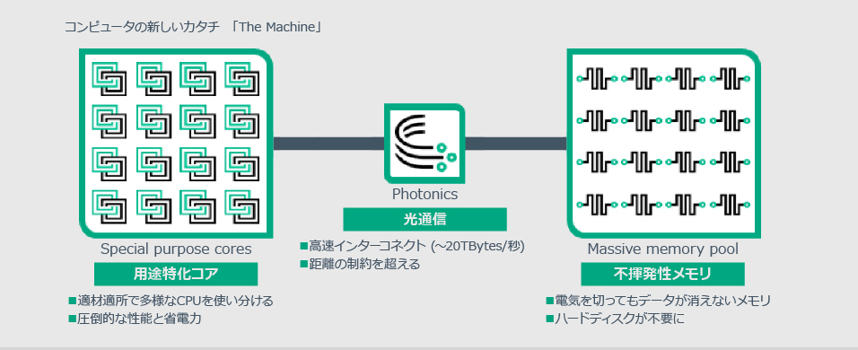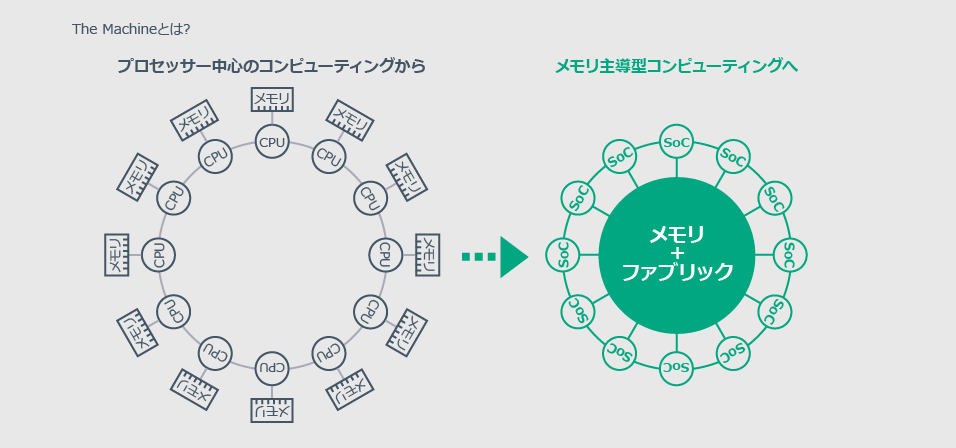 従来の“CPU主導型”から”メモリ主導型”へ。コンピュータの歴史と人との関わりを大きな転換点、それがHPEのテクノロジー「The Machine」。