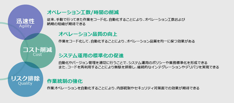 「Infrastructure as Code」でインフラ環境の設定手順をコード化。自動化によって作業コストを大幅に圧縮し、人の手によるミスを排除。構成変更時のバージョン管理等も容易になります。