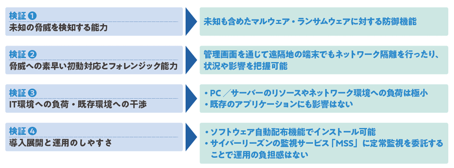 高精度で未知のマルウェアを検知できること、近年流行しているランサムウェアについても検知した瞬間にブロックできることが検証を通じて確認できました。