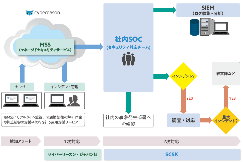脅威検知時の1次対応にサイバーリーズン社の監視サービス「MSS」を利用し、「MSS」では対処が難しいアラートに関してはSCSKの社内SOC(Security Operation Center)で2次対応を行っています。
