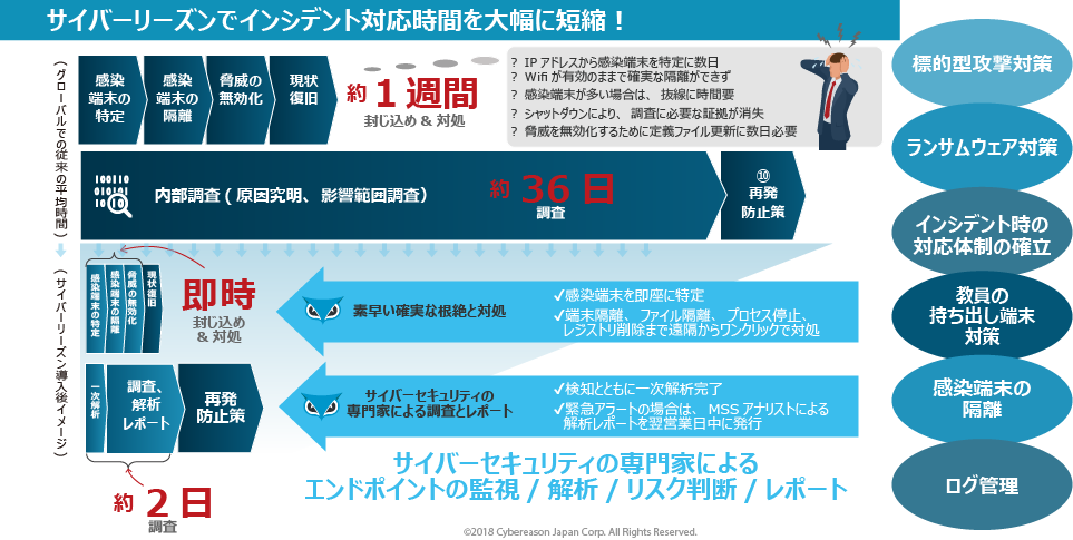 「Cybereason EDR」は、セキュリティに対する意識は高いものの、セキュリティ要員が足りない企業に適しています。初期対応の大部分を、サイバーリーズン社の「MSS」が担ってくれるので、少ない要員でも運用することができるのです。