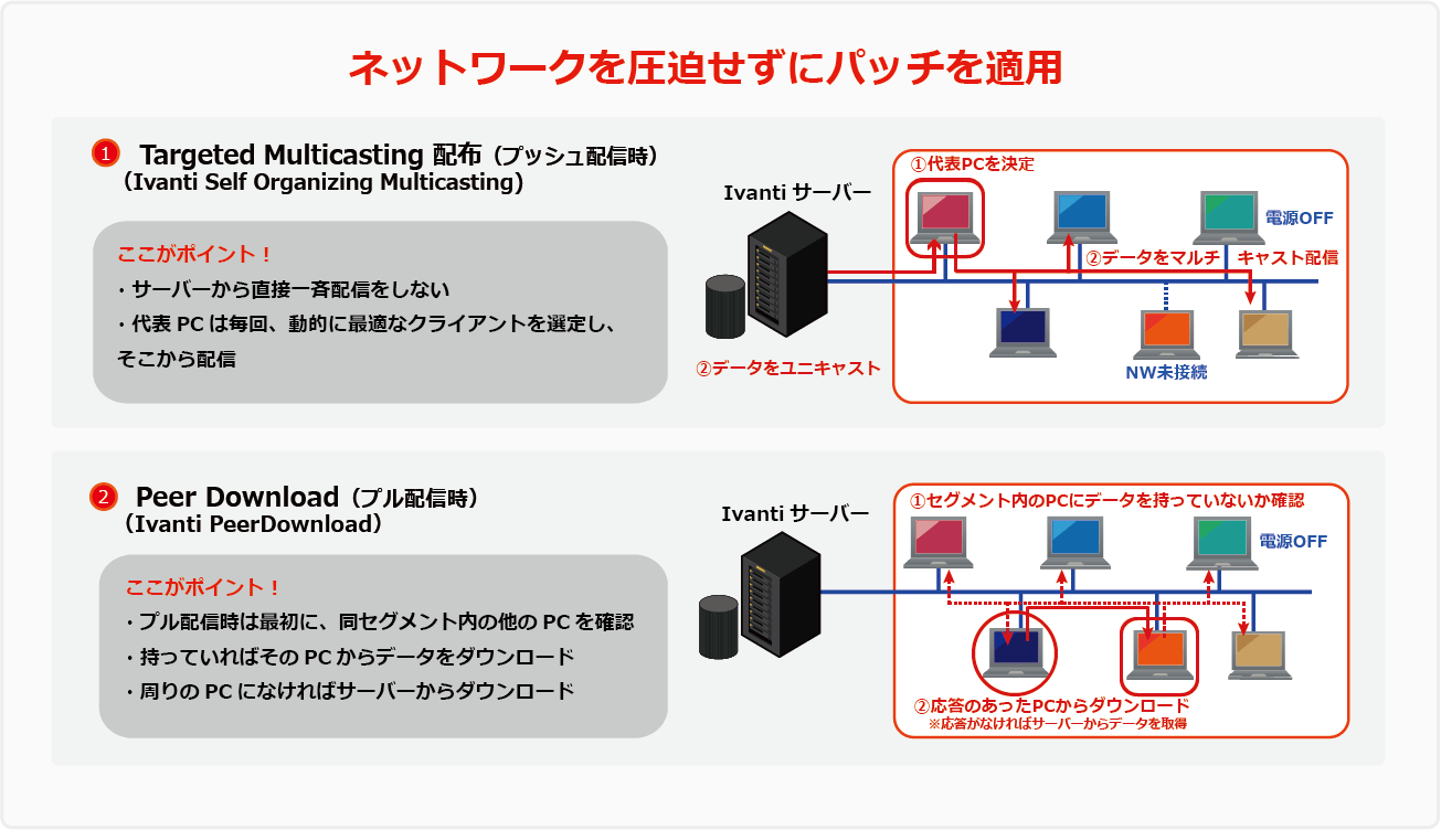 「Ivanti」は、アップデートファイルの配信に際し、WANへの影響を最小限に抑えることが可能です。具体的には、「Peer Download」と呼ばれるP2P技術を用い、拠点内の各セグメントの端末の中から自律的に代表クライアント(親端末)を選出して機能アップデートを行います。その後、親端末の周辺にある子端末は親端末から機能アップデートに必要なファイルを受信、さらに孫端末は周辺の子端末からファイルを受信・・と。いわばバケツリレー式に機能アップデートを行うため、WANとの通信は最初の親端末がダウンロードを行うときだけで済み、ネットワーク帯域の逼迫を防ぐことができます。