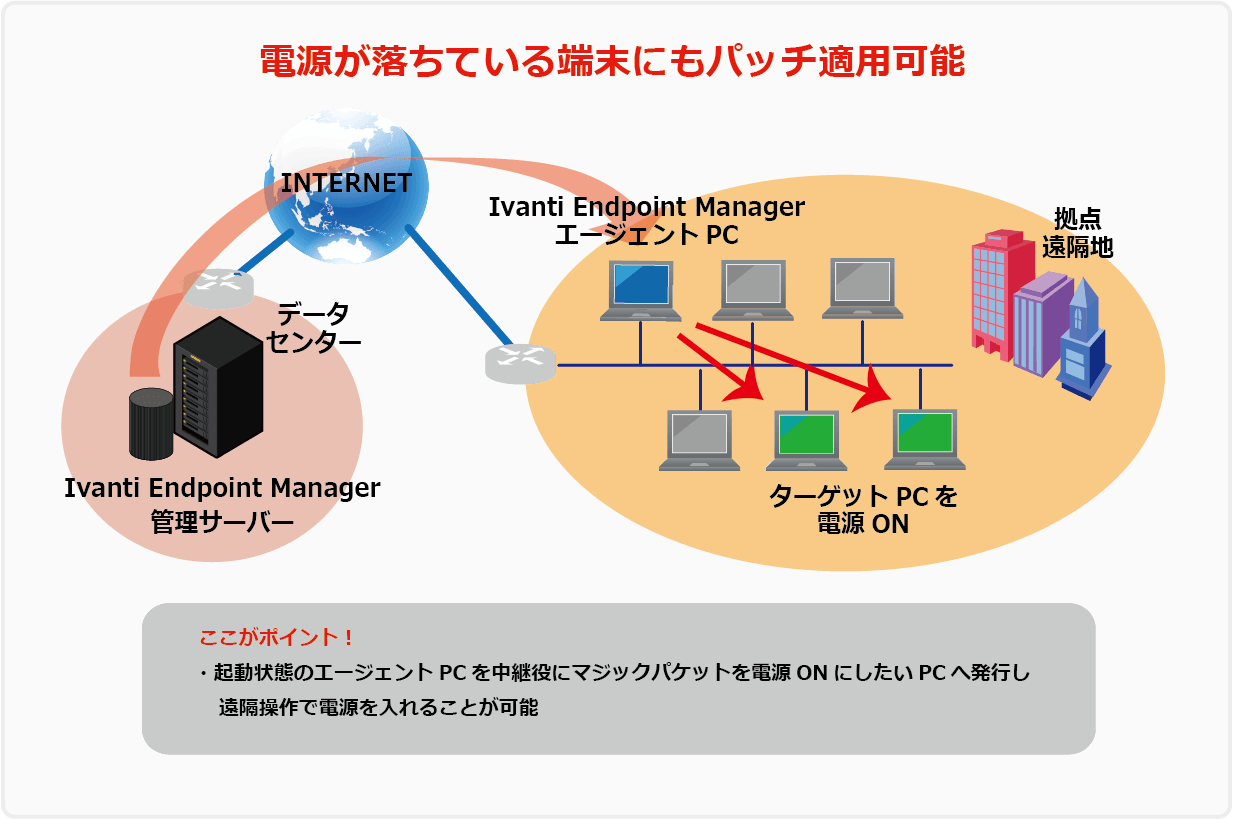 「Ivanti」は、端末の利用状況に合わせ、最適なタイミングで機能アップデートを実施することが可能です。たとえば、社員が出社しない週末に機能アップデートを一斉適用する場合、あらかじめユーザーに対し「ネットワークに接続し電源を入れておいてください」と依頼するのが一般的ですが、「Ivanti」なら「Wake-On-LAN」と呼ばれる機能を用いることで、電源が落ちている端末への適用も可能。ユーザーの手を煩わせる必要がありません。通常、「Wake-On-LAN」はWAN越しに端末を起動できませんが、前述の「Self Organizing Multicast」という技術を用いた「Wake-On-WAN」の機能により、セグメント内のすべての端末の電源を投入することができます。