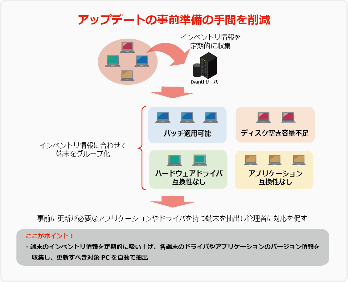 それゆえ機能アップデートに際しては、全社の端末についてドライバやアプリケーションなどのバージョンを確認し最新版へ更新しておくなど、入念な下準備が必要です。しかし、端末ごとに情報を収集し、このモデルのドライバはアップデートする、このアプリケーションは更新するといった作業を行うとなると、対象の端末リストを作成した上で配信登録を行わなくてはならず、大変な手間となります。そのためにも、各端末の情報を収集し、自動的・統合的に機能アップデートできる仕組みがあるとよいでしょう。