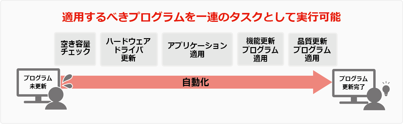 この機能を活用することで、Windowsの機能アップデートに際し、ハードウェアドライバ更新 →アプリケーション更新→機能更新プログラムの適用という一連のタスクを端末ごとにドミノ倒しで実行できるため、管理者の負担は大きく軽減されます。