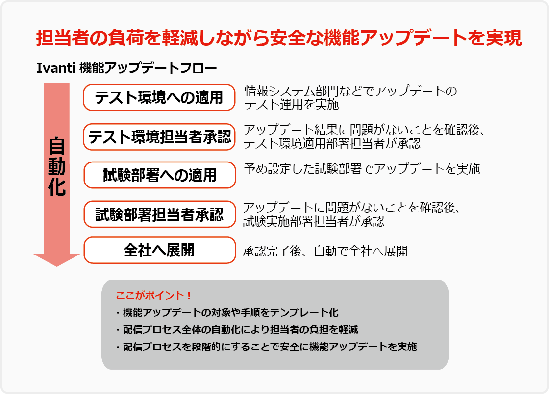 「Ivanti」は、機能アップデートの対象や手順をテンプレート化することができます。例えば、まず情報システム部門でテスト運用し、問題がなければ拠点のひとつで実業務に適用。それで何も起こらなければ全社へ展開…といったような配信プロセスを組むことで、段階的に安全な機能アップデートを実現します。