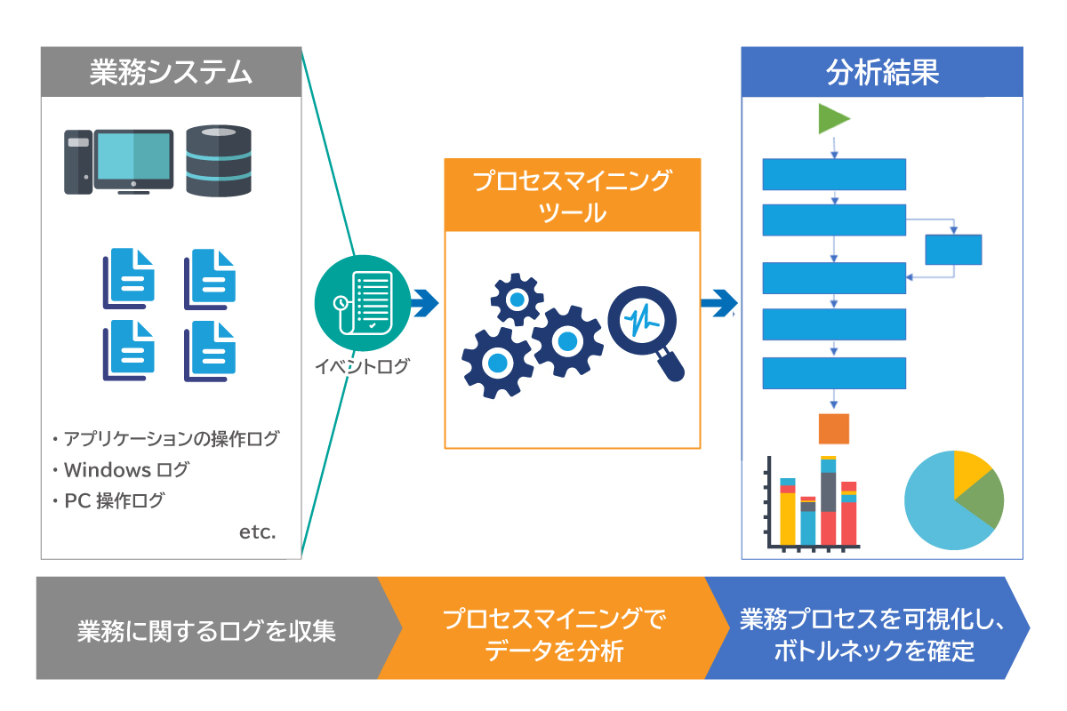 プロセスマイニングとは、さまざまなシステムやアプリケーションのログをもとに、業務プロセスを可視化・分析する技術です。具体的には、システムやアプリケーションのイベント発生の度に記録されるログを収集することで、現状の業務プロセスを正確に把握します。さらに分析することでボトルネックなどの問題がスピーディーに洗い出され、業務改善に活用できます。