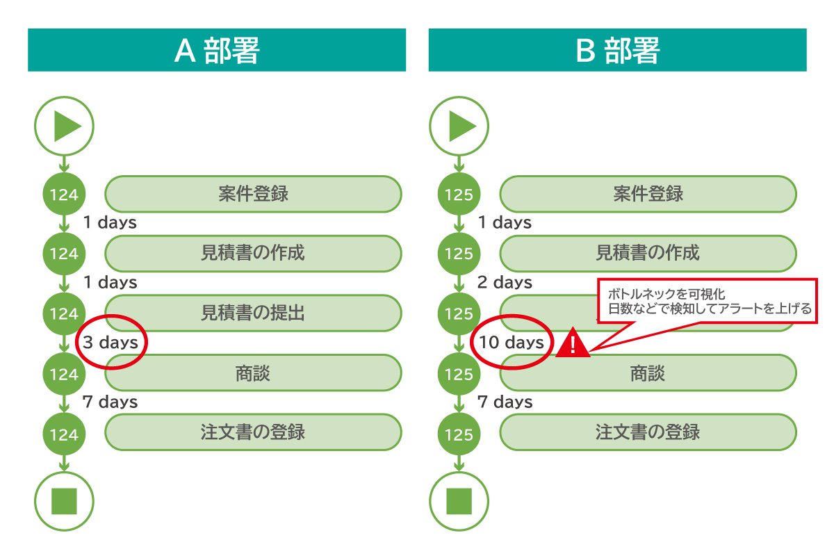 例えば売上が高いA部署では見積書の提出から商談まで3営業日しかかかっていないのに対し、売上が低いB部署では10日もかかっているという結果が出た場合、そこがボトルネックになっている可能性が高いと考えられます。そこで、なぜB部署では時間がかかるのか、より詳細なプロセスを分析して原因を特定したり、3営業日たっても商談に移っていないプロセスを検知すると担当者にアラートをあげたりといった自動化によって、営業プロセスの効率化を支援します。