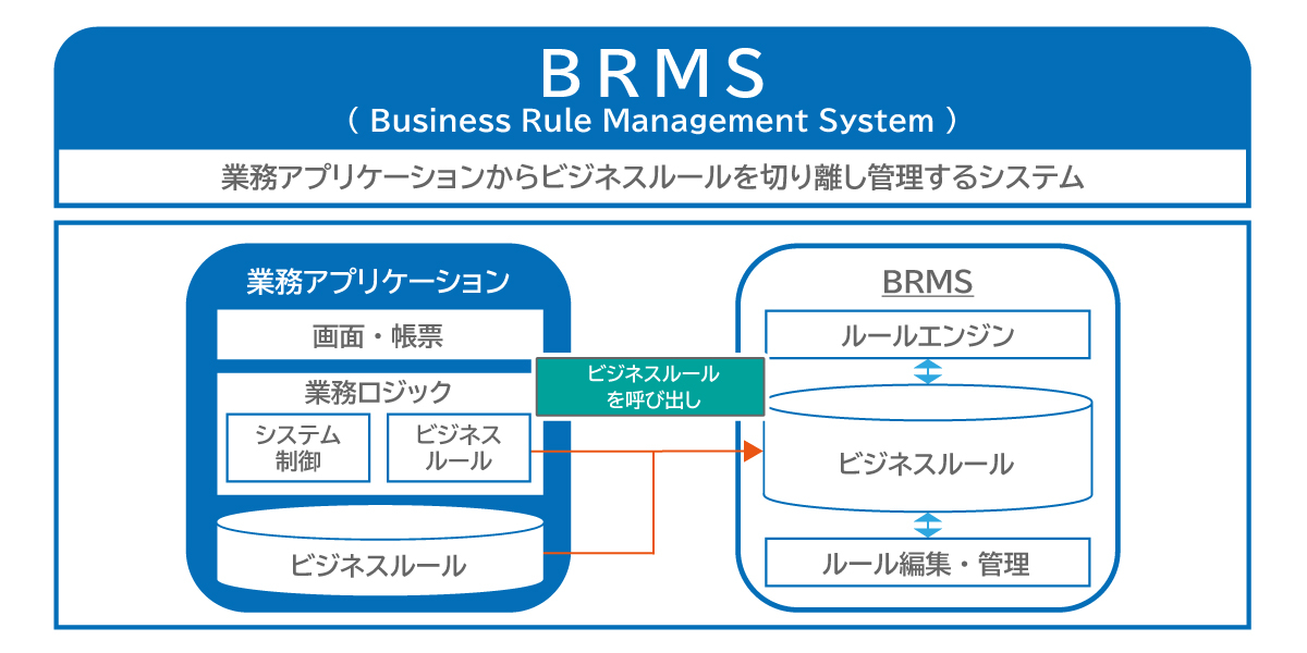 まずBRMSとは、システムの中にある業務ロジックやデータベースに点在しているビジネスルールを切り出し、一元的に登録・管理・実行するシステムです。