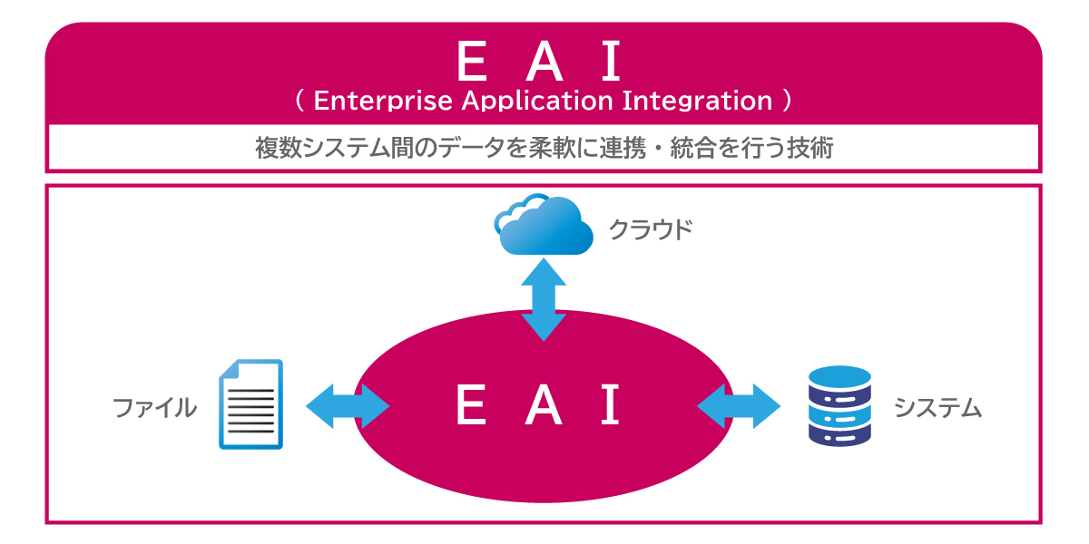 続いてEAIとは、いろいろなシステムを繋いでデータをやりとりするためのハブのようなもので、異なるシステム間でのデータの統合と自動化を促進するツールです。