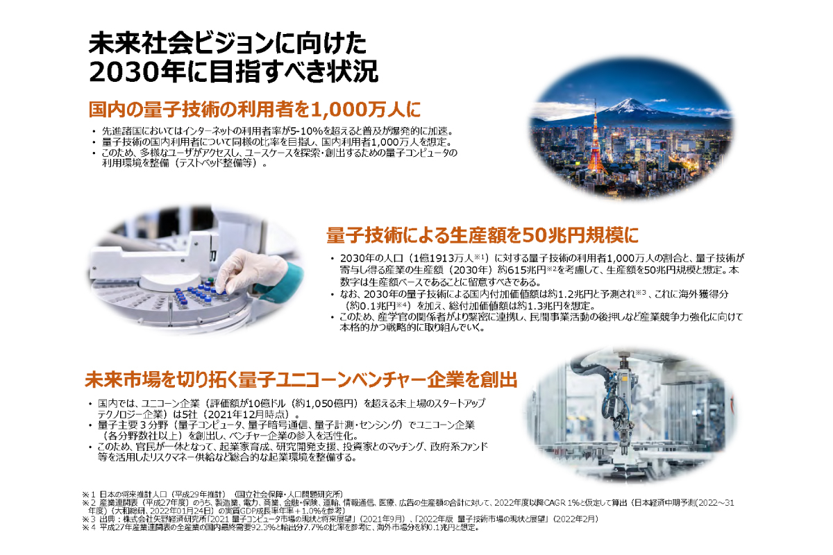 一方、日本は「量子未来社会ビジョン」を掲げ、2030年までに国内で1,000万人の量子技術ユーザーまで増やすことを目標に掲げています。具体的には、1,000万人が「意識せず」量子コンピュータを使っている状態を指し、量子コンピュータが日常生活の裏側で動いている、そんな身近な存在になることを目指しています。この数字は、インターネットが一気に普及した際のユーザー数を参考にしたもので、量子技術を社会インフラとして定着させるためのマイルストーンとして位置づけられています。
