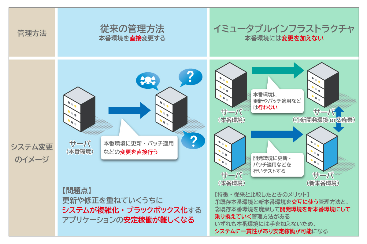 従来のインフラ環境では、本番環境の運用中にソフトウェアなどのバージョンアップやパッチ適用などを直接行います。しかし本番環境への修正や更新が重なっていくと、やがてシステムが複雑化してしまい、稼働が不安定になるなど障害の起こる可能性、運用チームの負担やコストの増大、セキュリティ上のリスクなどが問題となりました。
