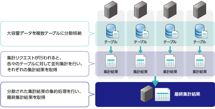 大規模なデータをさらに高速に集計処理するために、独自の「並列分散処理機能(マルチビュー機能/マルチサーバー機能)」を搭載。増加しつづけるビジネスデータにも、スケーラブルに対応できます。