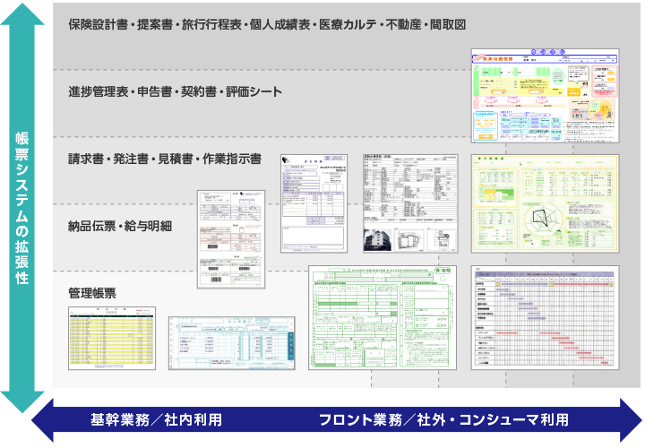日本固有のきめ細かな帳票からお客様に提出するグラフィカルな帳票まで、業種・業務を問わず、さまざまな帳票レイアウトをノンプログラミングで作成できます。バーコードやチャートにも対応し、8ヶ国語での帳票出力も可能。既存の帳票をベースに簡単に帳票設計することもできます。