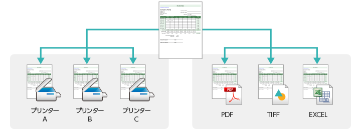 各社プリンターメーカーのコマンド出力に対応しているため、用途に応じて高速印刷、最適な印刷環境を構築できます。PDF、Excel、TIFFなど、一つの帳票を用途に応じて最適なファイルフォーマットで出力することも可能です。