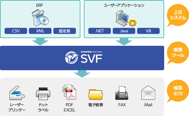 SVFを導入すれば、システムごとに帳票ツールを使い分ける必要はありません。ホスト、オフコン、ERP、ユーザーアプリケーションなど、さまざまな上位システムと連携し、各上位システムに格納された帳票データと作成した帳票フォームをマージして、ノンプログラミングで帳票出力することができ、帳票のオープン化を実現します。