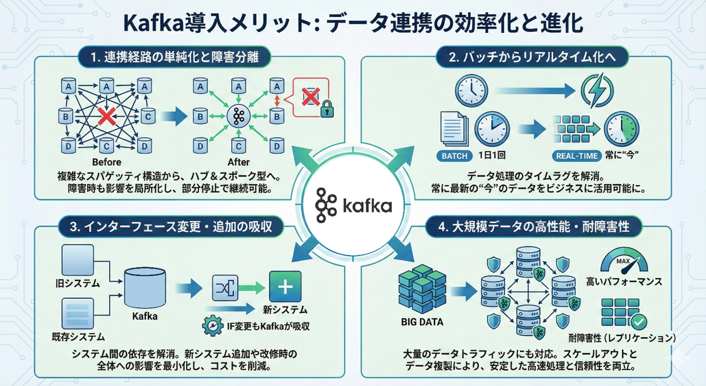 Apache Kafkaは、分散型でスケーラブルなストリーミングデータプラットフォームです。 特徴的なのは「超高速スループット」「低レイテンシ」「自動冗長化・切替で止まらない」設計思想です。 Kafka導入することで、データ連携に関して下記4点の効果が期待できます。
