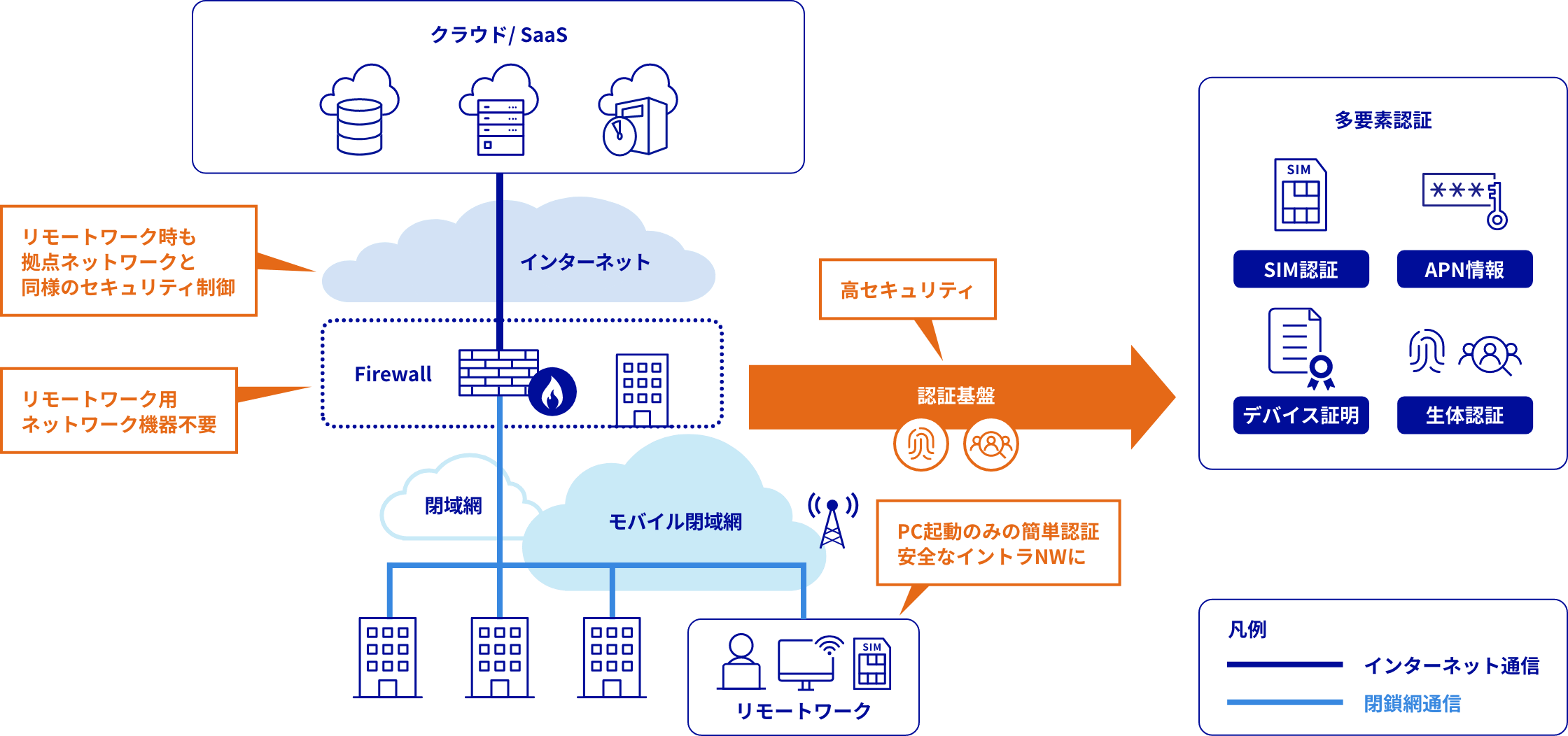 SIM標準セキュリティ(SIM認証 + ID/パスワード認証)に加え、多要素認証(デバイス認証 + 生体認証)を追加し、SIMカード盗難や不正デバイスからのモバイル閉域網への不正な接続をブロックするサービスです。