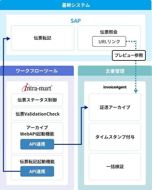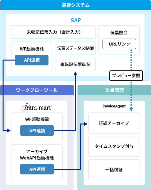 電子帳簿保存法対応のワークフロー/文書管理ソリューション「intra-mart」「invoiceAgent 文書管理」とのAPI連携を標準装備しています。