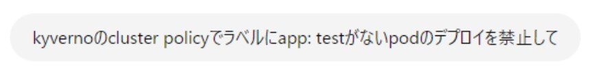 OPA Gatekeeperと異なり、ルール強制のためにデプロイが必要なオブジェクトは一つだけです。 今回もChat GPTに頼んでCluster Policyのyamlファイルを作成してもらおうと思います。 それでは実際に試してみましょう。 まずはChat GPTにマニュフェストの作成を頼みます。