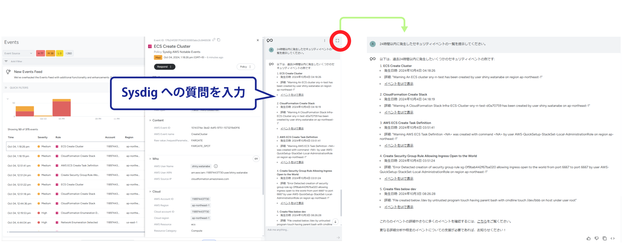- 深い洞察の提供 AI専門家による豊富な知識と経験を基に、Sysdig Sageはセキュリティ脅威に関する詳細な分析結果を提供します。これにより、インシデントの根本原因を正確に把握し、最適な対策を講じることができます。