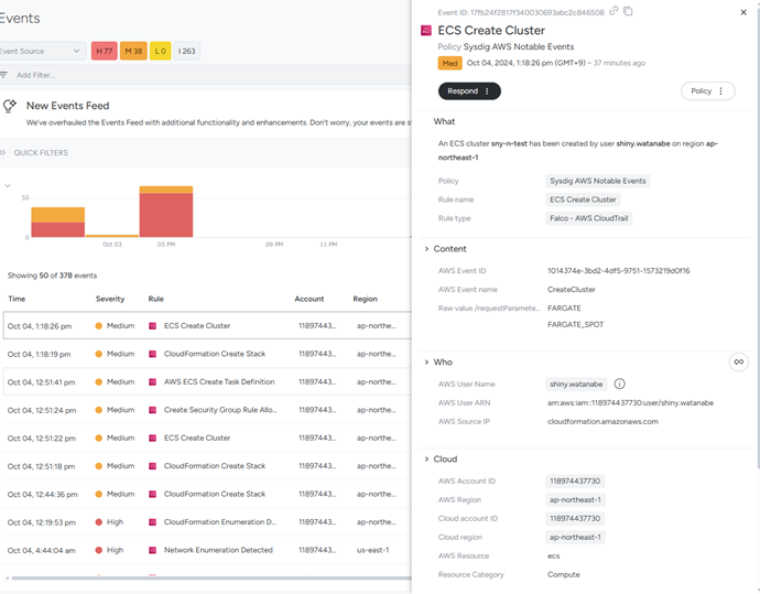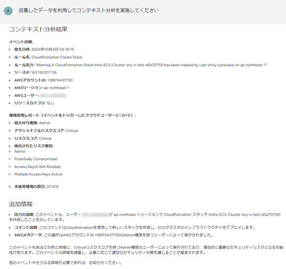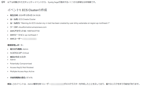 総括: 両方のイベントとも、XXXXXというAdmin権限を持つユーザーによる操作であり、重大なセキュリティリスクを伴っています。 これらのイベントは迅速に対応する必要があり、特に以下の点を考慮すべきです: ユーザー XXXXXX による上記操作は正当なものであるかを確認。 2.アクセスキーの回転と、使用していないアクセス権限の見直しを実施。 3.CloudFormationスタックおよびECSクラスターの作成が正規のプロセスに従って行われていることを確認。