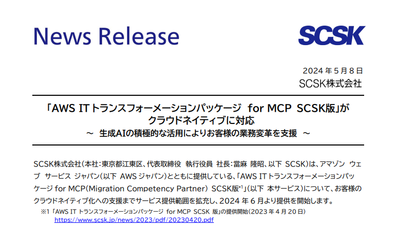 SCSKは、アマゾン ウェ サービス ジャパン(以下 AWS ジャパン)とともに提供している、「AWS IT トランスフォーメーションパッケージ for MCP(Migration Competency Partner) SCSK版*1」(以下 本サービス)について、お客様のクラウドネイティブ化への支援までサービス提供範囲を拡充し、2024 年 6 月より提供を開始します。