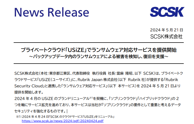SCSKは、プライベートクラウドサービス「USiZE(ユーサイズ)」に、Rubrik Japan 株式会社が提供する「RubrikSecurity Cloud」と連携した「ランサムウェア対応サービス」(以下 本サービス)を 2024 年 5 月 21 日より提供を開始します。