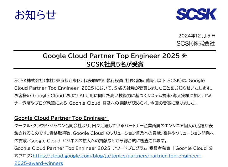 SCSK株式会社(本社:東京都江東区、代表取締役 執行役員 社長:當麻 隆昭、以下 SCSK)は、Google Cloud Partner Top Engineer 2025 において、5名の社員が受賞しましたことをお知らせいたします。 お客様の Google Cloud およびAI活用に向けた高い技術力に基づくシステム提案・導入実績に加え、セミナー登壇やブログ執筆による Google Cloud 普及への貢献が認められ、今回の受賞に至りました。
